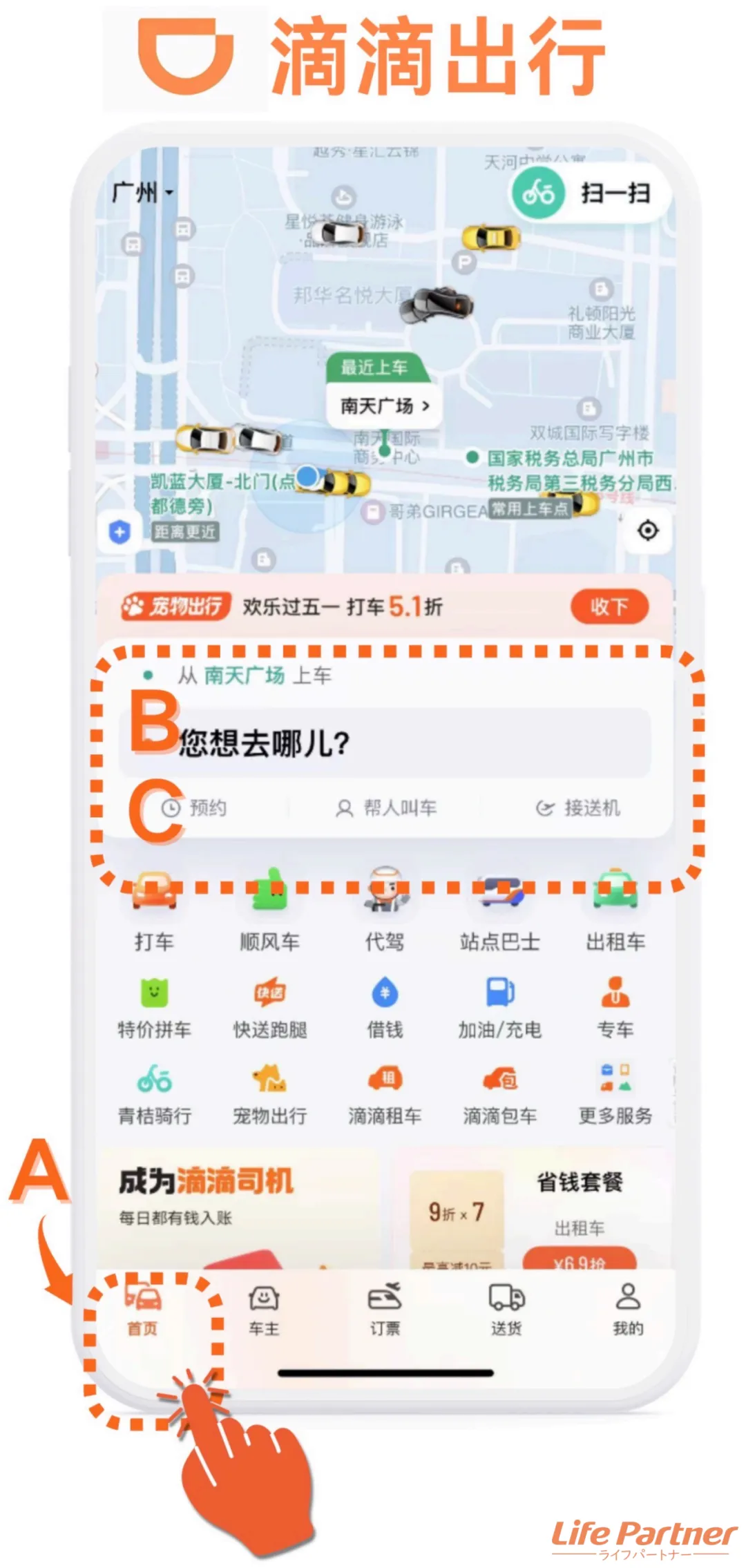 TOP画面の上半分に表示されるサービス内の「DiDi Travel ※」をタップして上述同様に操作でOKです