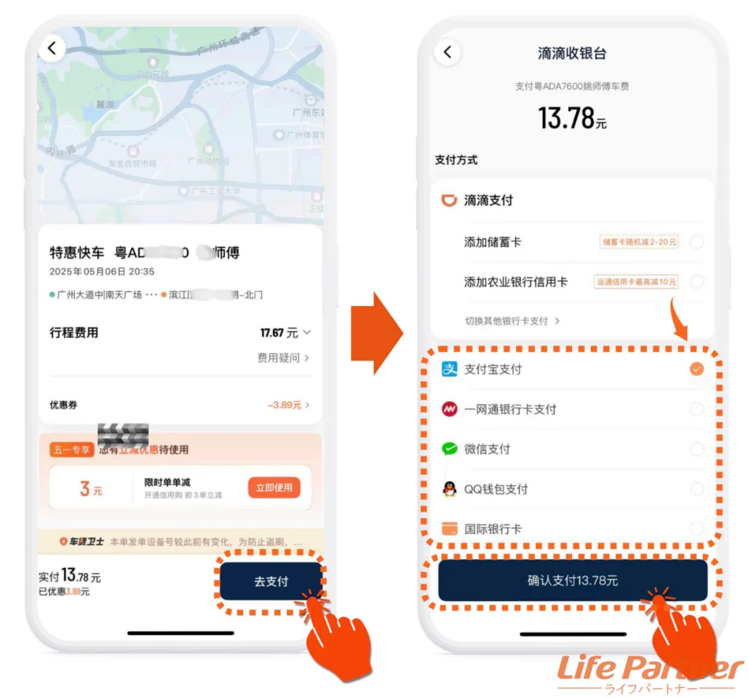 次の画面で金額を確認し、問題なければ支払い方法を選択して下部にある「确认支付※※元」をタップ