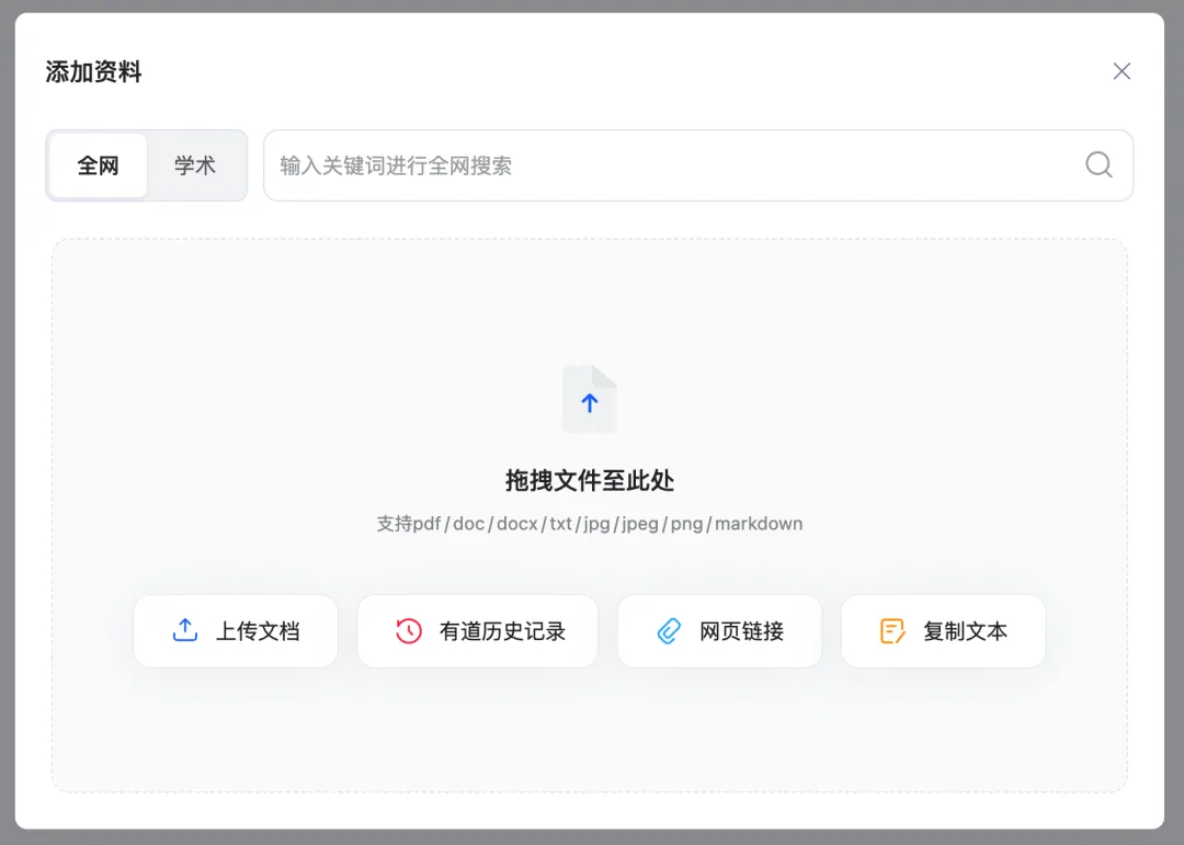 我现在只需要把资料丢到有道宝库里,PDF、Word、图片都行,网页链接也行。