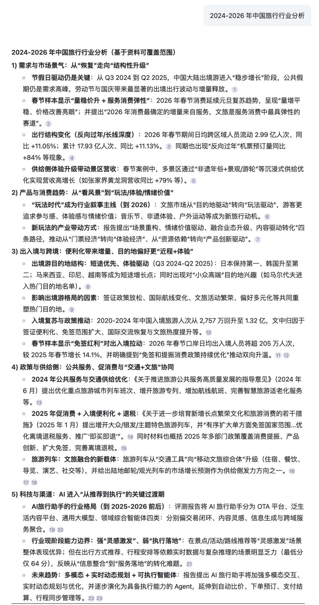 比如:「2024-2026 年中国旅行行业的核心增长趋势、用户需求变化、政策利好分别是什么?哪些是长期确定性趋势,哪些是短期风口?」