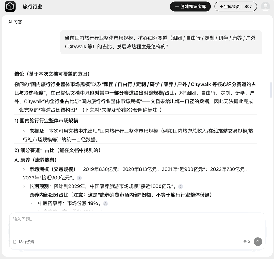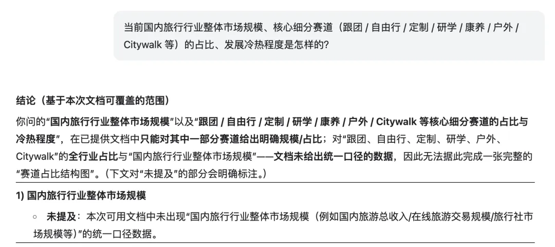 比如:「当前国内旅行行业整体市场规模、核心细分赛道(跟团 / 自由行 / 定制 / 研学 / 康养 / 户外 / Citywalk 等)的占比、发展冷热程度是怎样的?」