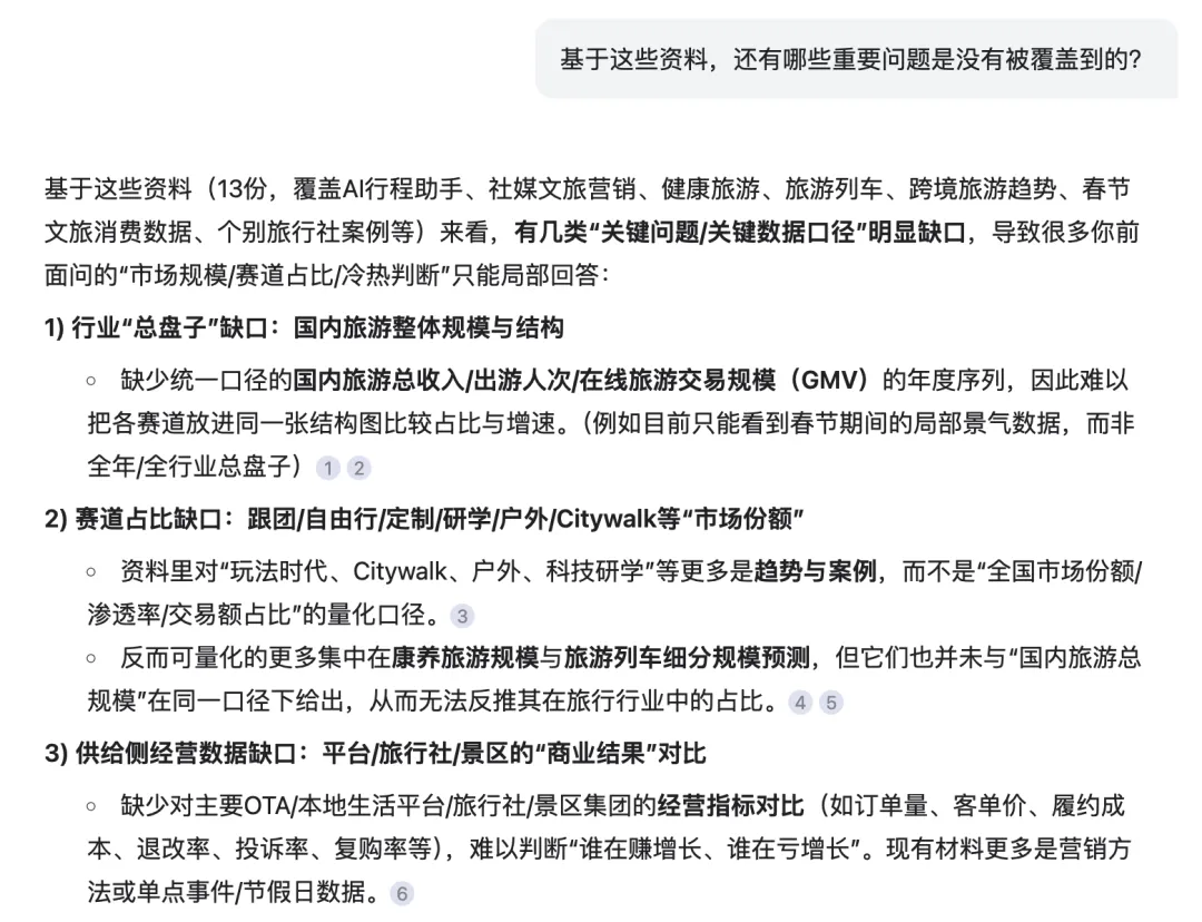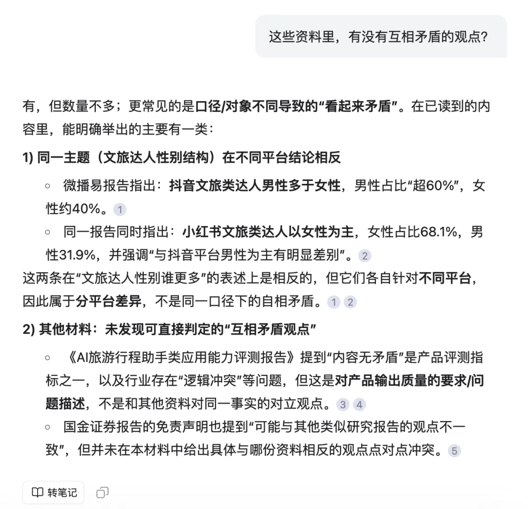 比如:「这些资料里,有没有互相矛盾的观点?」 「不同报告的数据有没有对不上的地方?」