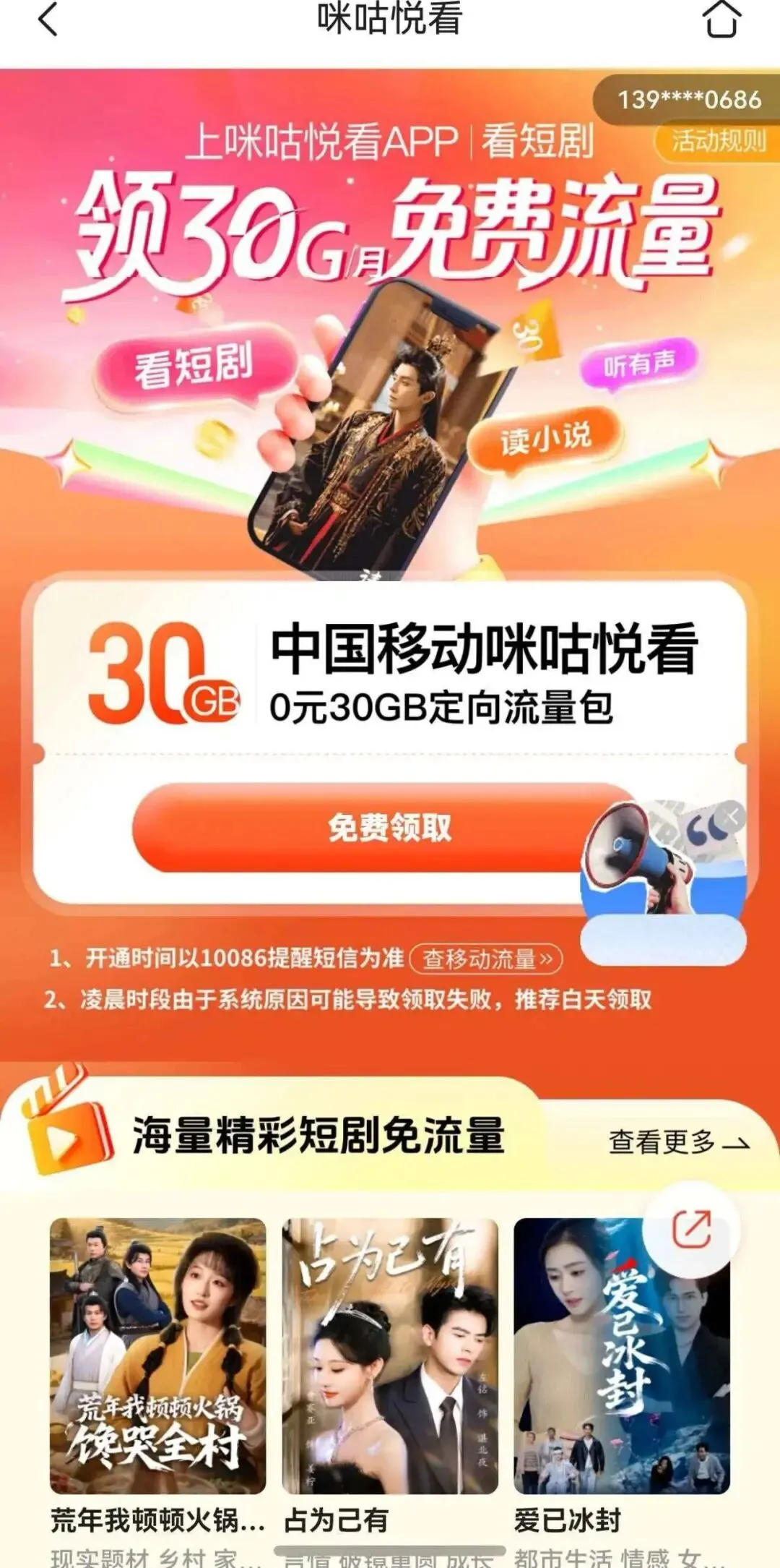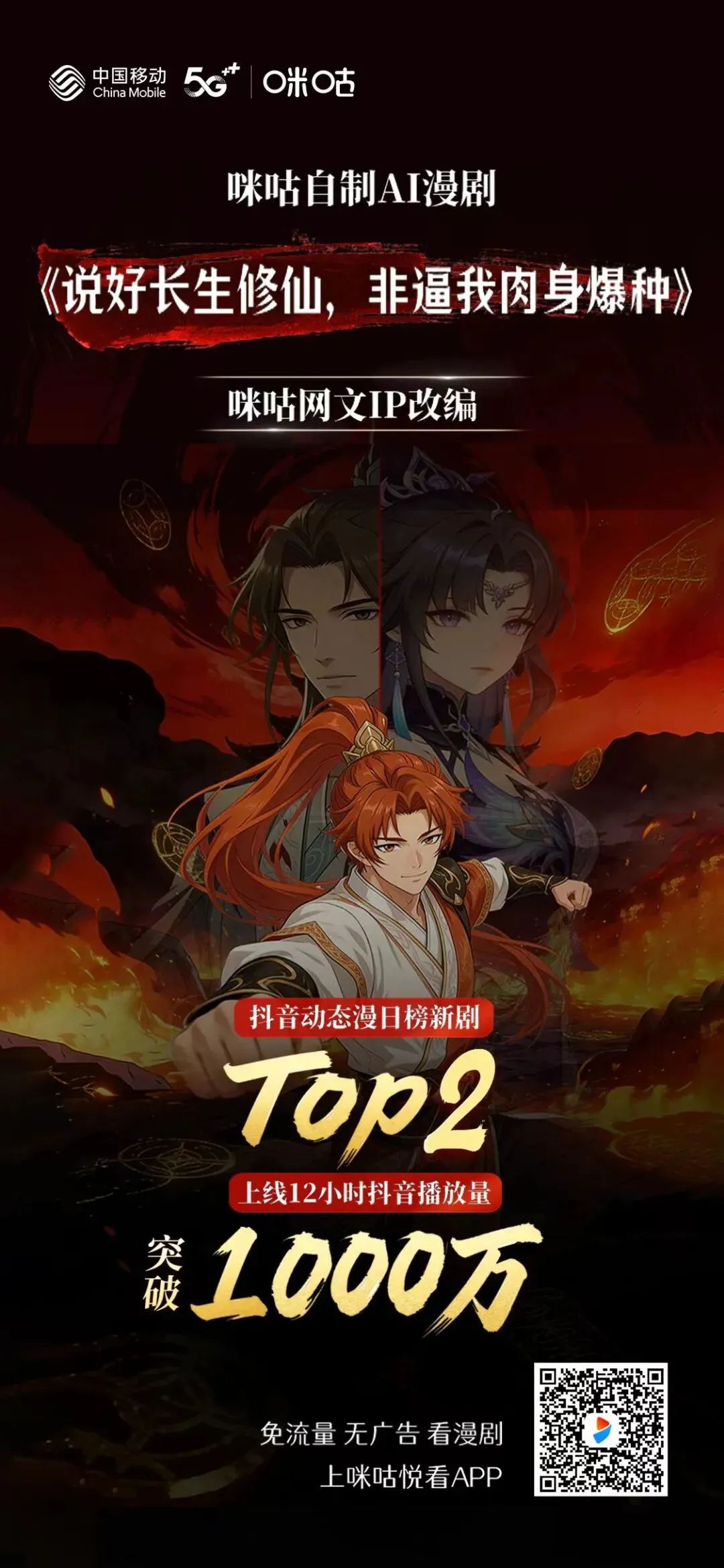 领流量看短剧,就上咪咕悦看APP 💡根据咪咕悦看网文IP改编 🎬自制AI漫剧《说好长生修仙》 💥抖音动态漫日榜新剧TOP2 🎉上线12小时播放量1000万+ 👉u.cmread.com/erxb9Wa 手机应用商店搜索“咪咕悦看”,或扫描下方二维码即可下载 免费定向流量领取路径:打开咪咕悦看APP-我的-下方30G流量领取界面-点击领取即可 对于短剧迷宝子们,我们推出了咪咕短剧体验包,只要9.9元/月,每月可看10部短剧并获得100G夜间通用流量,详询10086或前往线下移动营业厅都可办理~ 编辑:晏理政 初审:易沙 复审:焦杨 签发:王燕