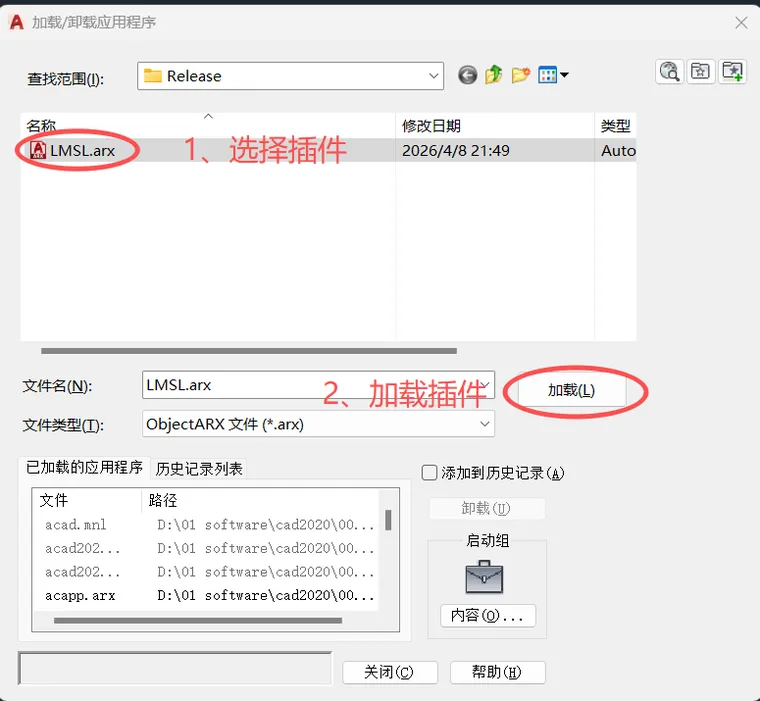 1、CAD2020命令行输入“appload”选择并加载插件;