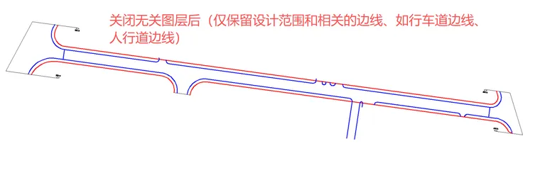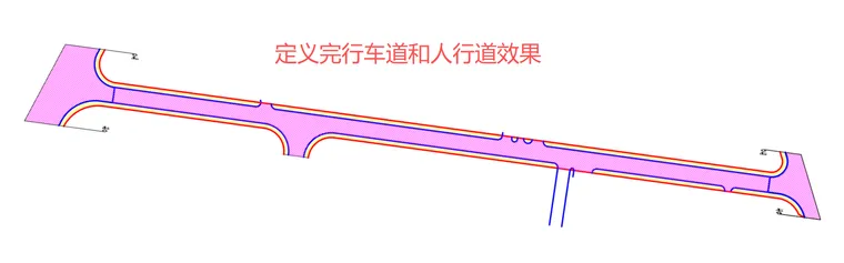 6、定义路缘石方法同上,下拉选择路缘石类型并点击确定,然后在CAD中选择要定义成目标路缘石类型的直线、圆弧或多段线即可,行车道、人行道定义完成效果如下;