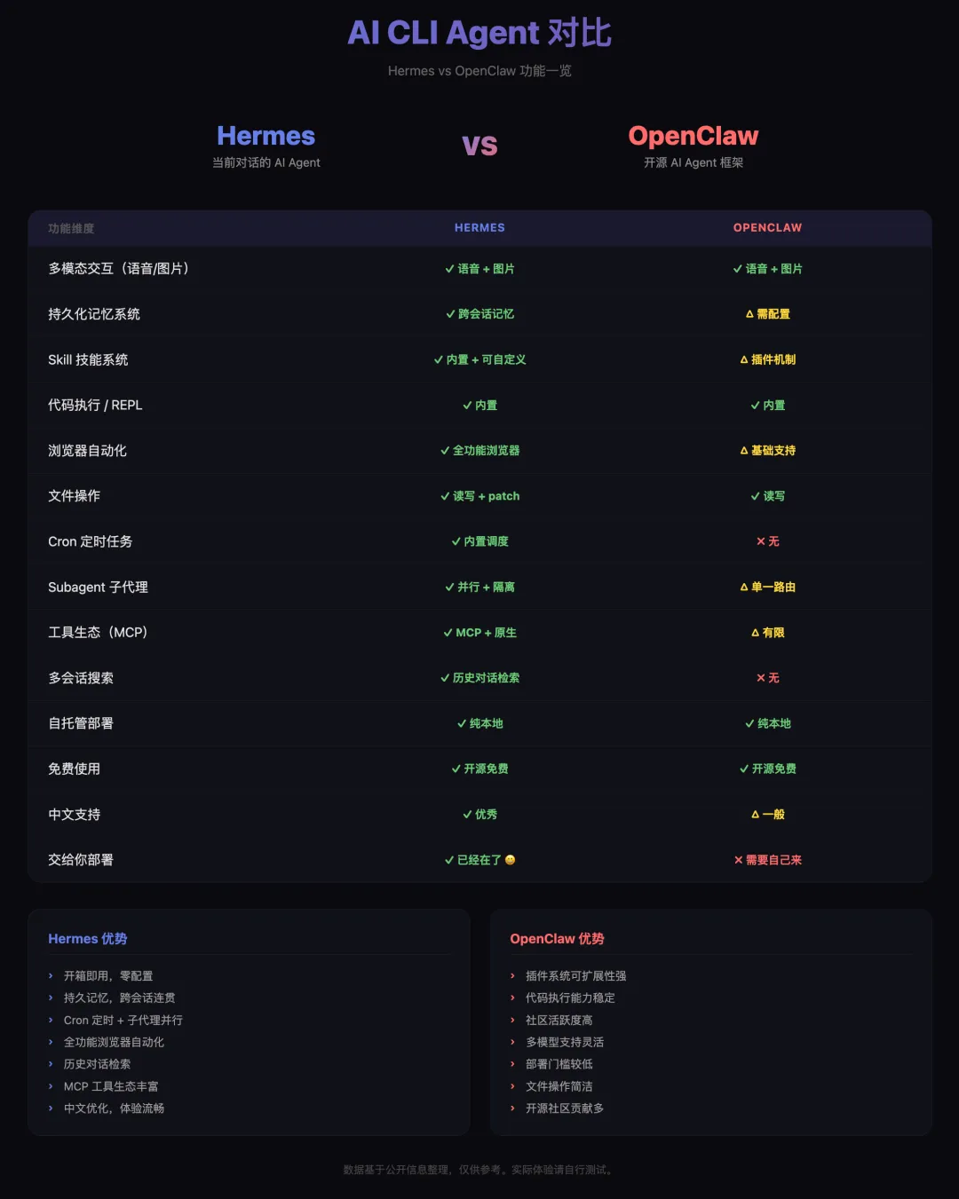 Hermes 和 OpenClaw 功能上高度重叠,都是 AI Agent 框架,都支持多平台接入和记忆系统。主要区别: