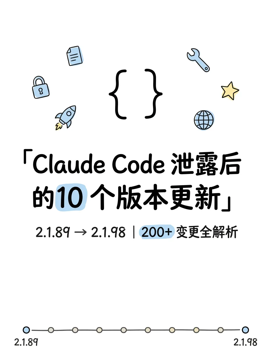 3月31日,Claude Code 2.1.88 的 npm 包因为打包错误,把完整源码泄露了。泄露后的这十天,然Anthropic 连发了 10 个版本,200 多项变更。我把每个版本的 changelog 都过了一遍,整理出了完整的更新脉络。