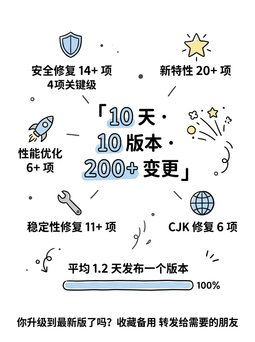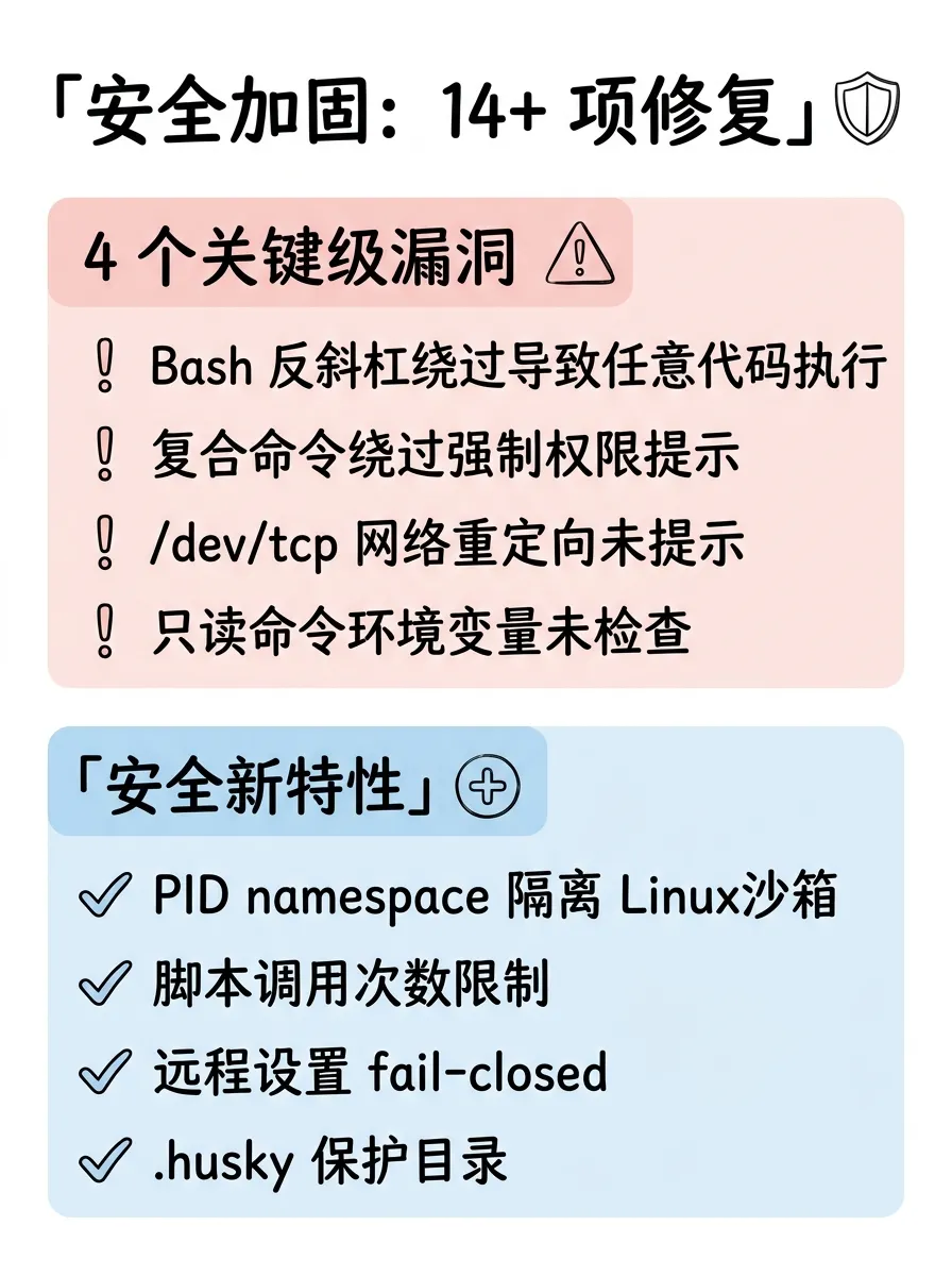 10 天 10 个版本,200 多项变更,安全修复占了大头。从结果来看,泄露事件客观上推动了一轮全面的安全审计,很多 Bash 命令层面的权限绕过问题在这一轮被集中修掉了。
