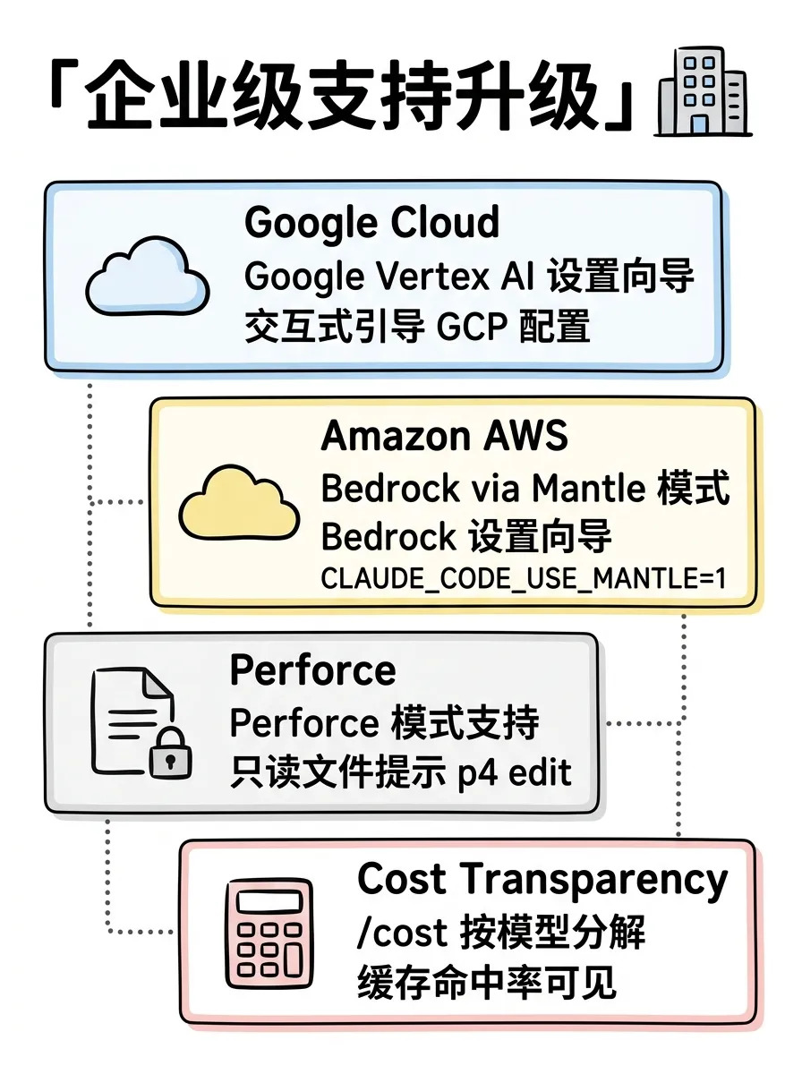 企业侧的支持也在快速补齐,Bedrock 和 Vertex AI 都有了交互式设置向导,不用再手动改配置文件了。Perforce 模式则是给还在用 Perforce 做版本管理的团队准备的,编辑只读文件时会提示先跑 p4 edit。