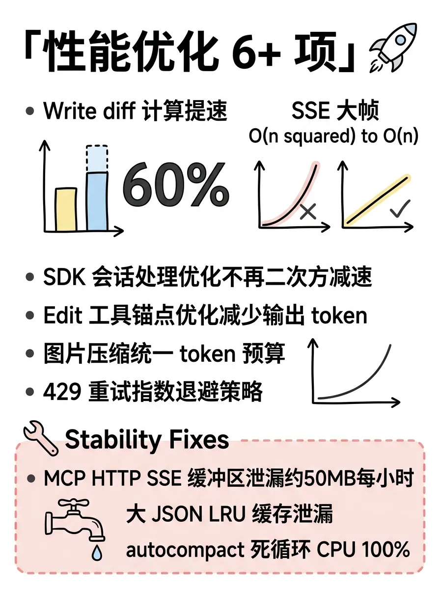 Write 工具的 diff 计算提速 60% 这个改动,在处理包含 tabs、&、$ 等特殊字符的文件时特别明显。之前遇到这类文件 diff 计算会很慢,现在基本感觉不到延迟了。