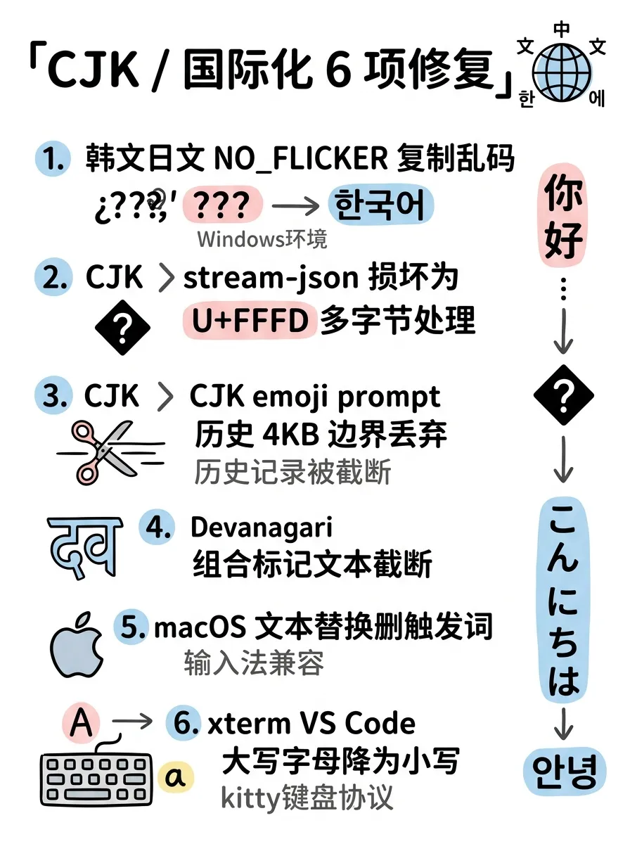 CJK 文本 stream-json 损坏这个问题之前挺多人反馈的,中文输出到一半突然变成乱码(U+FFFD 替换字符),2.1.94 修掉了。历史记录在 4KB 边界丢失也是个老问题,CJK 字符占多字节,刚好卡在分片边界上就会被截断。