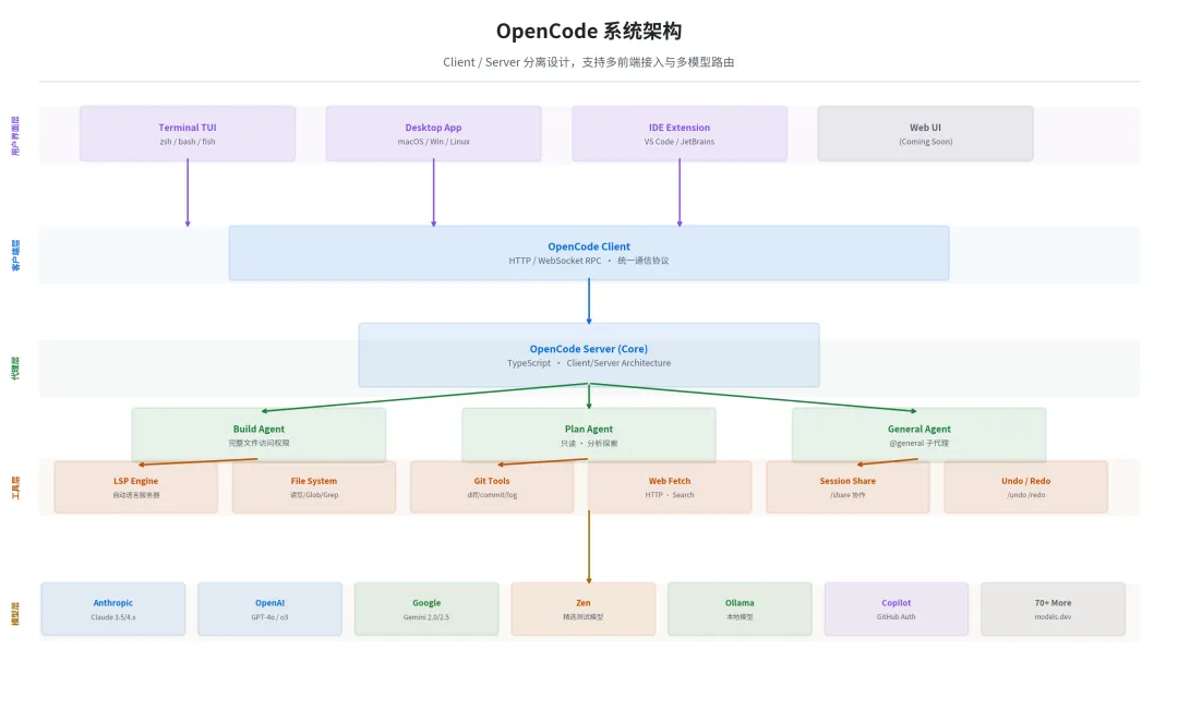 OpenCode 采用Client/Server分离的架构设计。核心服务以独立进程运行,不同前端(TUI、桌面 App、IDE 插件)通过 HTTP/WebSocket RPC 与之通信。这种解耦使得 OpenCode 可以轻松支持远程操作,甚至在服务器上无头运行。