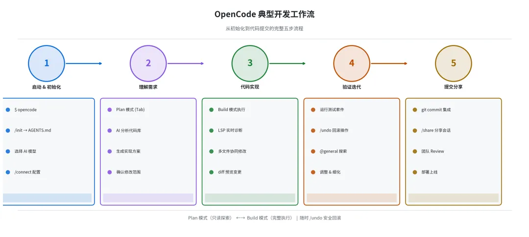 每次 AI 执行文件修改前,OpenCode 自动创建快照。用户可随时输入 /undo 将整个代码库回滚到上一次 AI 操作之前的状态,配合 /redo 形成完整的操作历史。