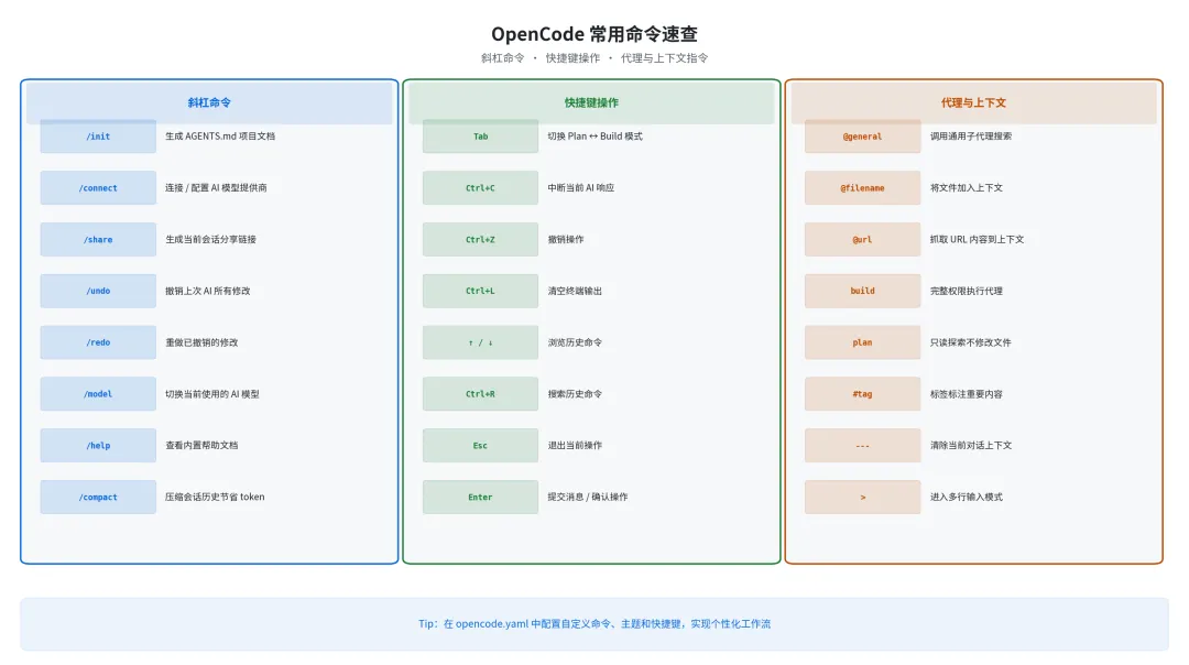 启动&初始化:运行 opencode 启动 TUI,/init 生成 AGENTS.md 作为项目知识库;