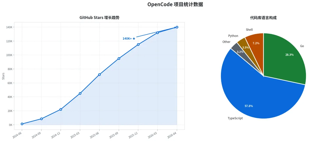 从增长曲线可以看出,OpenCode 在 2025 年初经历了一次爆发式增长,这与 SST 团队发布 v0.1 正式版、并在 Hacker News 获得高热度讨论密切相关。此后项目保持稳定高速增长,在 2026 年 Q1 突破 140K Stars。