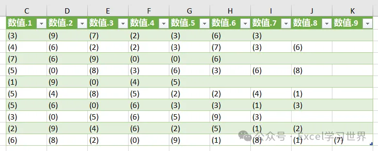 将下图 1 的单元格中的每一位数字拆分成一列,且在每个数字外面加上英文半角括号,效果如下图 2 所示。
