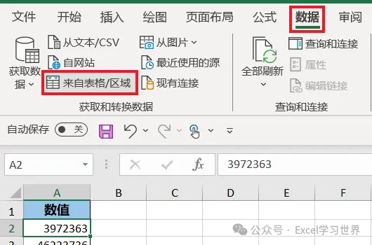 1. 选中数据表的任意单元格 –> 选择工具栏的“数据”–>“来自表格/区域”