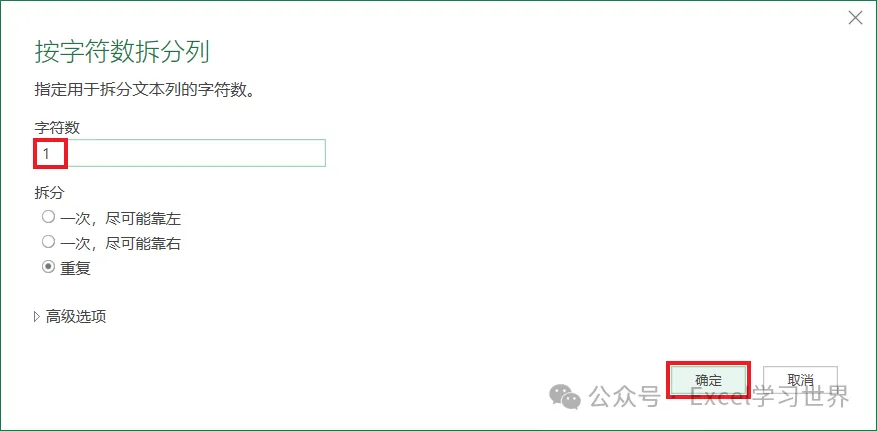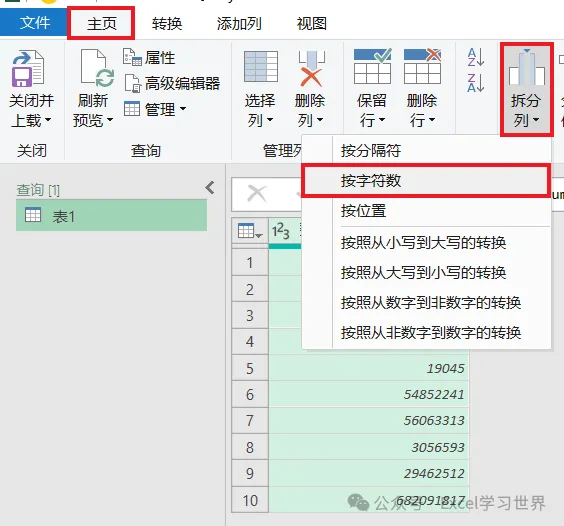3. 选择工具栏的“主页”–>“拆分列”–>“按字符数”