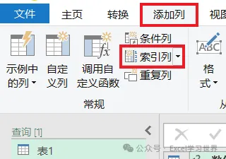 5. 选择工具栏的“添加列”–>“索引列”