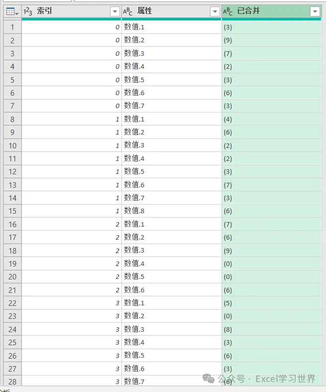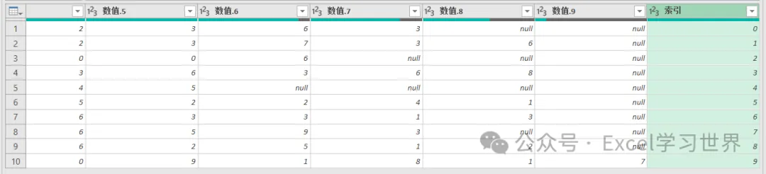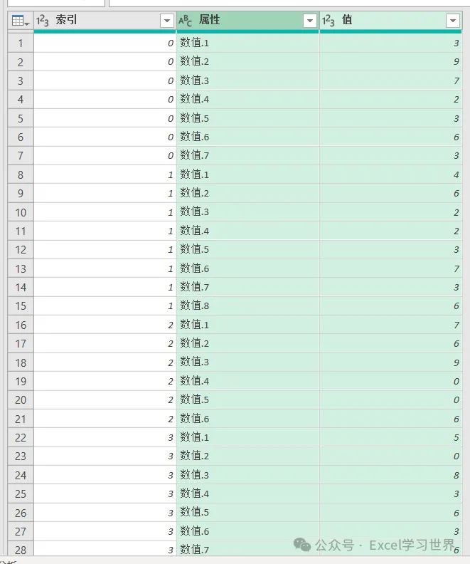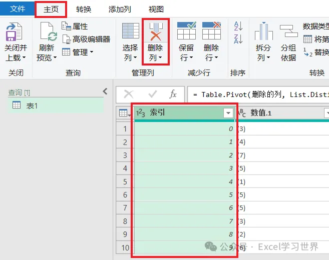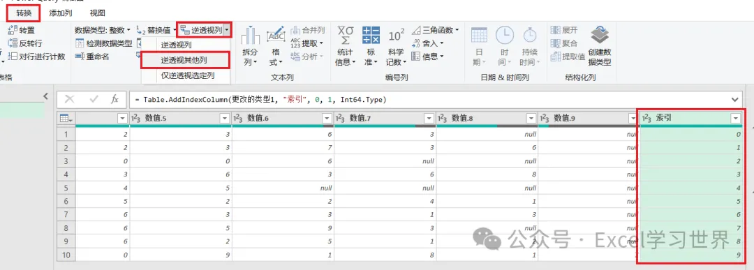 6. 选中“索引”列 –> 选择工具栏的“转换”–>“逆透视列”–>“逆透视其他列”