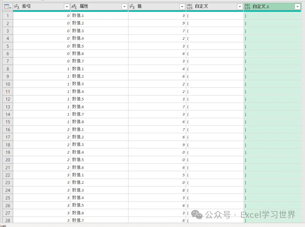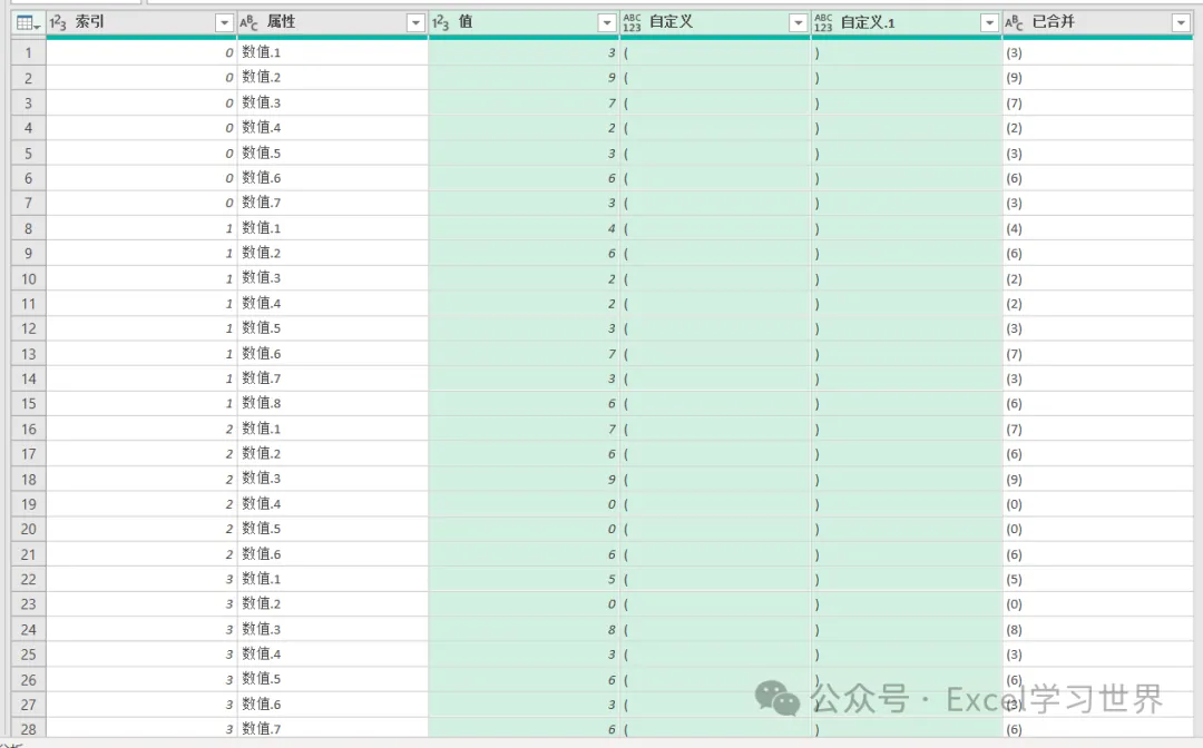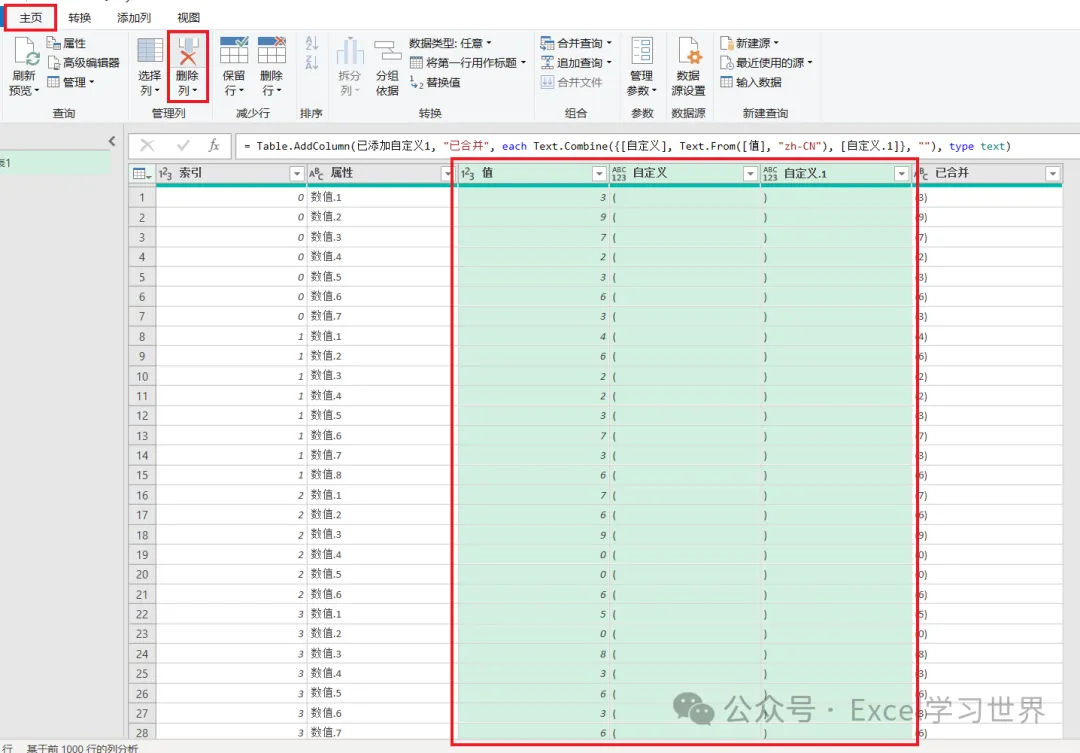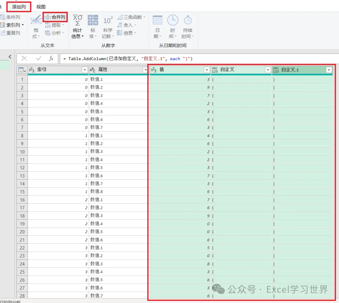 11. 按先后顺序依次选中“自定义”、“值”和“自定义.1”列 –> 选择工具栏的“添加列”–>“合并列”