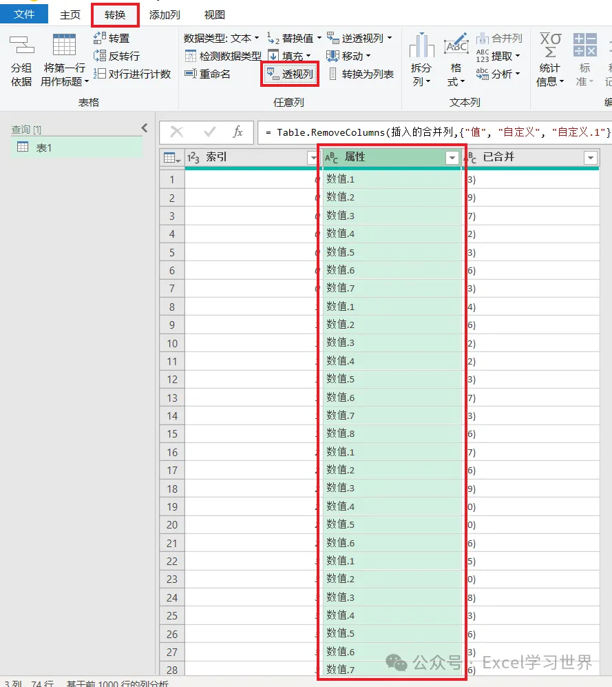14. 选中“属性”列 –> 选择工具栏的“转换”–>“透视列”