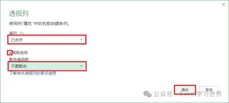15. 在弹出的对话框的“值列”中选择“已合并”–> 点开“高级选项”–> 选择“不要聚合”–> 点击“确定”