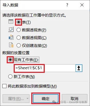 18. 在弹出的对话框中选择“表”–> 选择“现有工作表”及所需上载至的位置 –> 点击“确定”