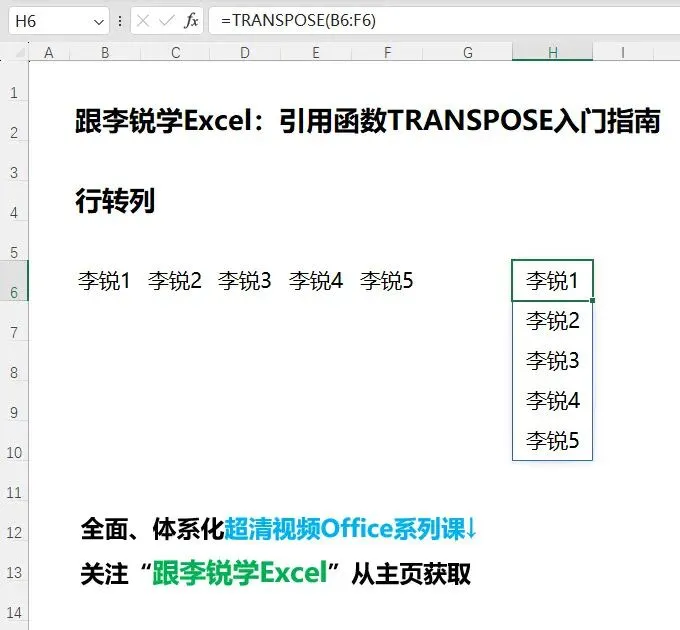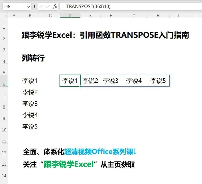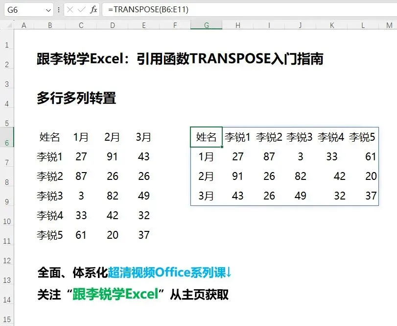 TRANSPOSE函数用于转置单元格区域或引用的方向:行转列、列转行、多行多列行列转置等