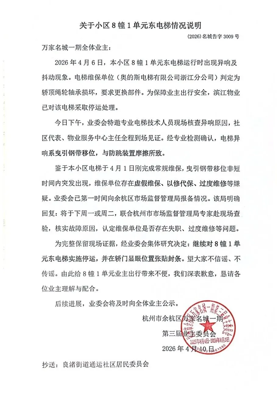 2026年4月6日,本小区8幢1单元东电梯运行时出现异响及抖动现象。电梯维保单位(奥的斯电梯有限公司浙江分公司)判定为轿顶绳轮轴承损坏,要求更换部件。为保障业主出行安全,滨江物业已对该电梯采取停运处理。