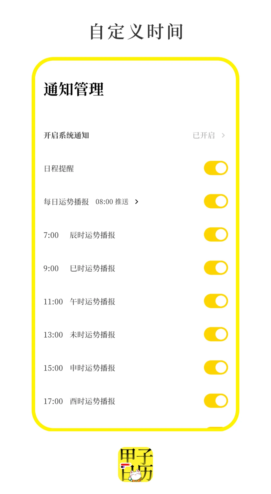 在「设置」——「通知管理」中,支持自定义时间设置,更贴合你的生活节奏。你可自由指定每日运势的推送时间,如设定早上 8:00 准时推送。