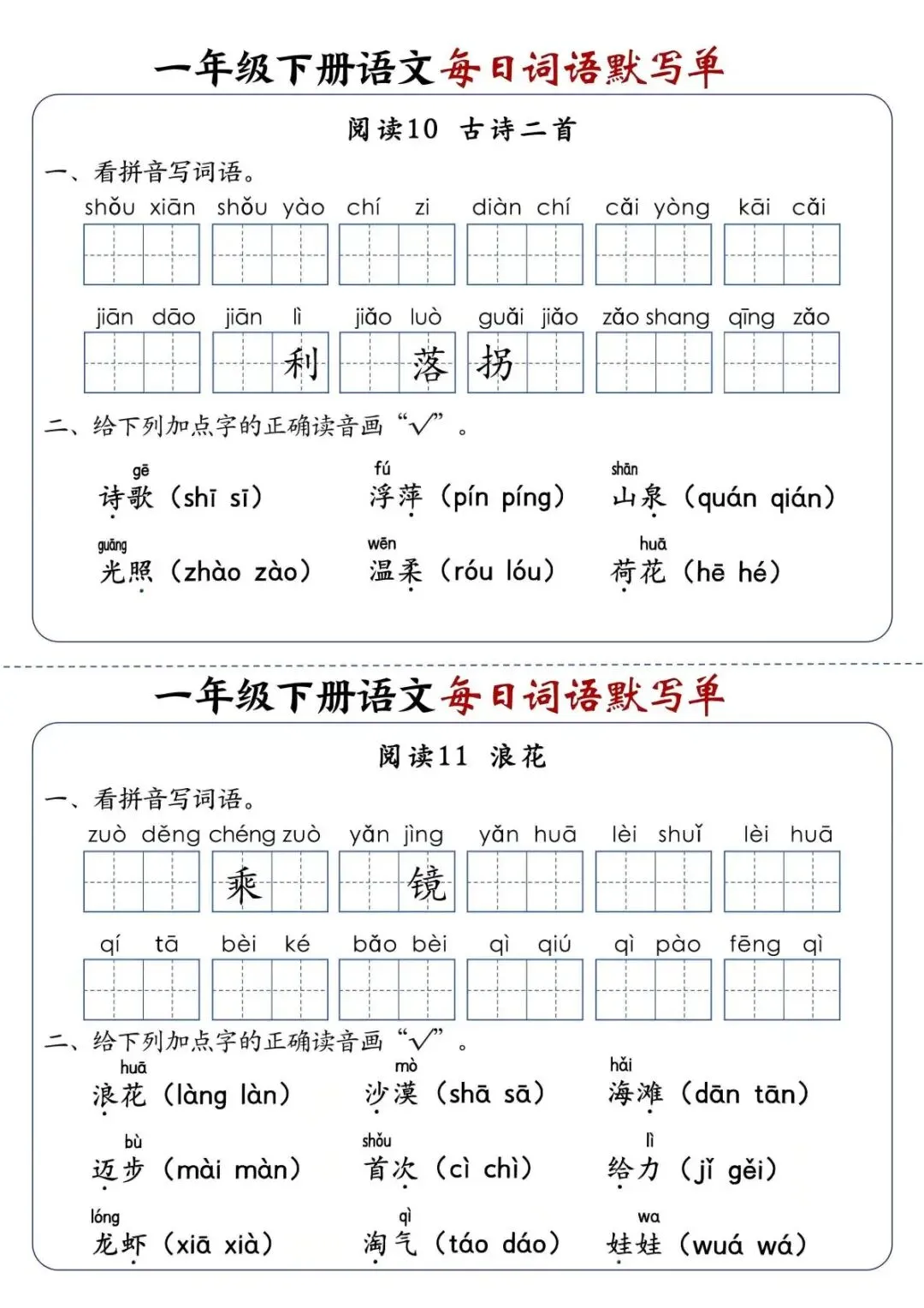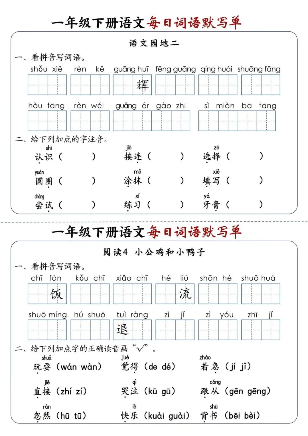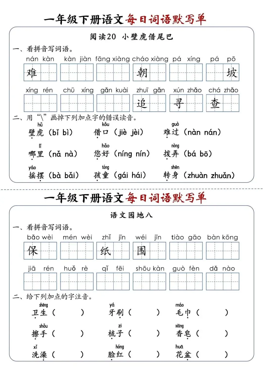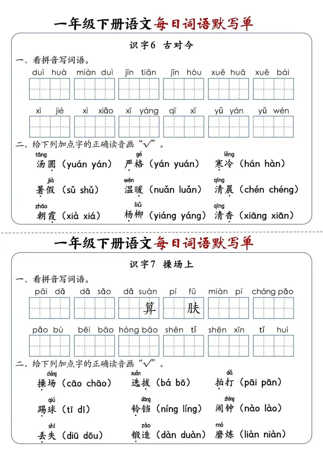 一年级下册部编版语文《每日词语默写单》附答案| 电子版可打印.看拼音写词语、加点字读音辨析两大题型,贴合教材考点,每日一练夯实字词基础。孩子逐页巩固,轻松掌握生字词,为语文学习筑牢根基,家长辅导、孩子自学都超实用!需要的家长抓紧领取一份给孩子打印🖨️出来,让孩子练一练吧✍🏻欢迎分享到班级群或朋友圈,方便家长打印出来助力孩子高效学习!