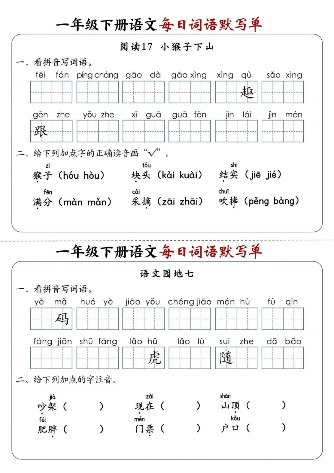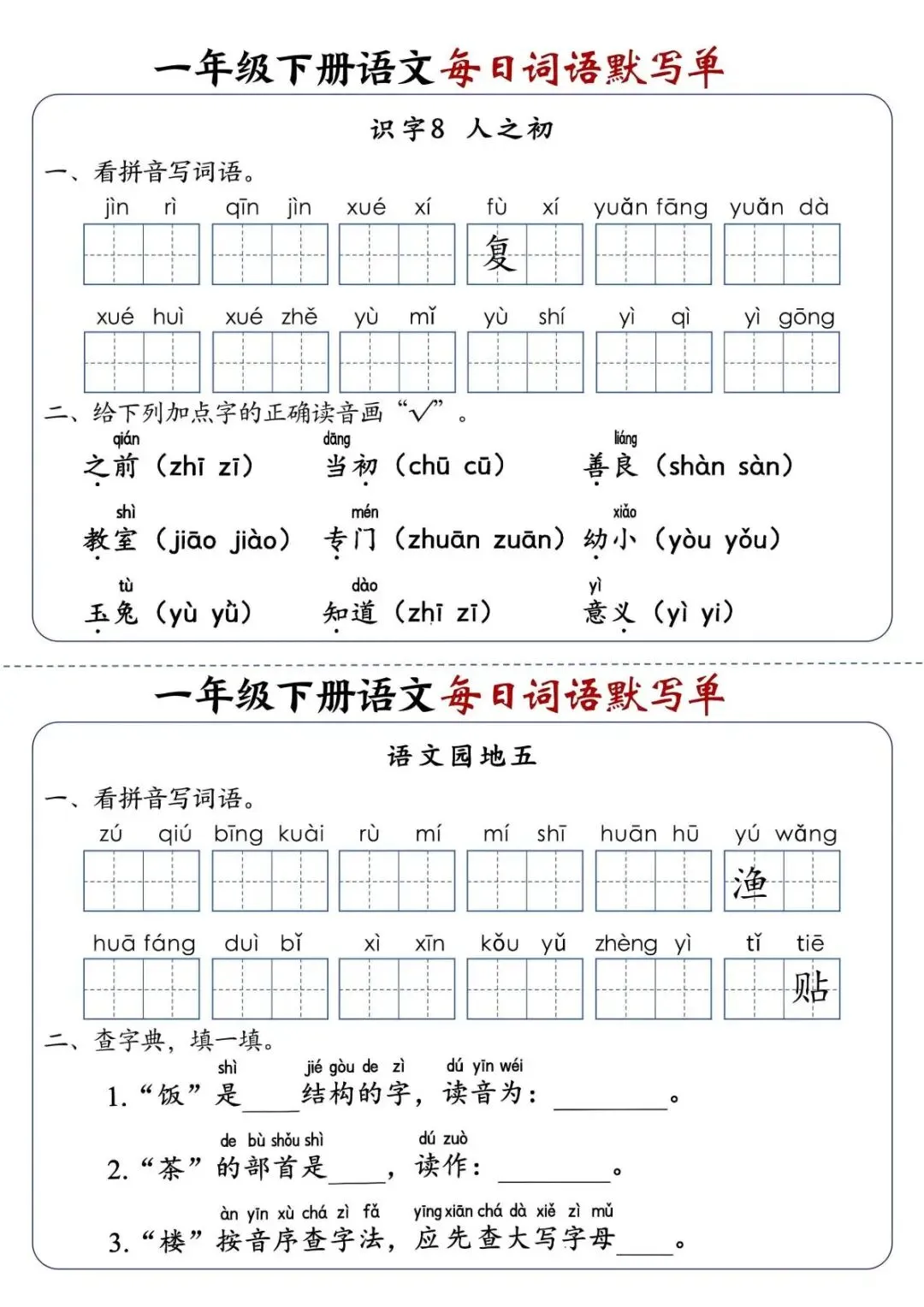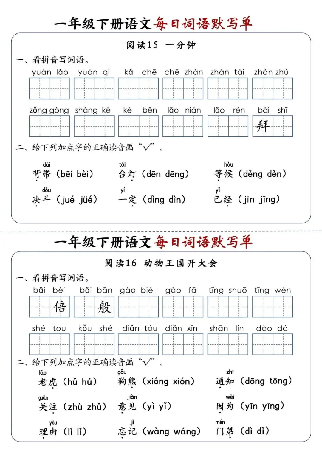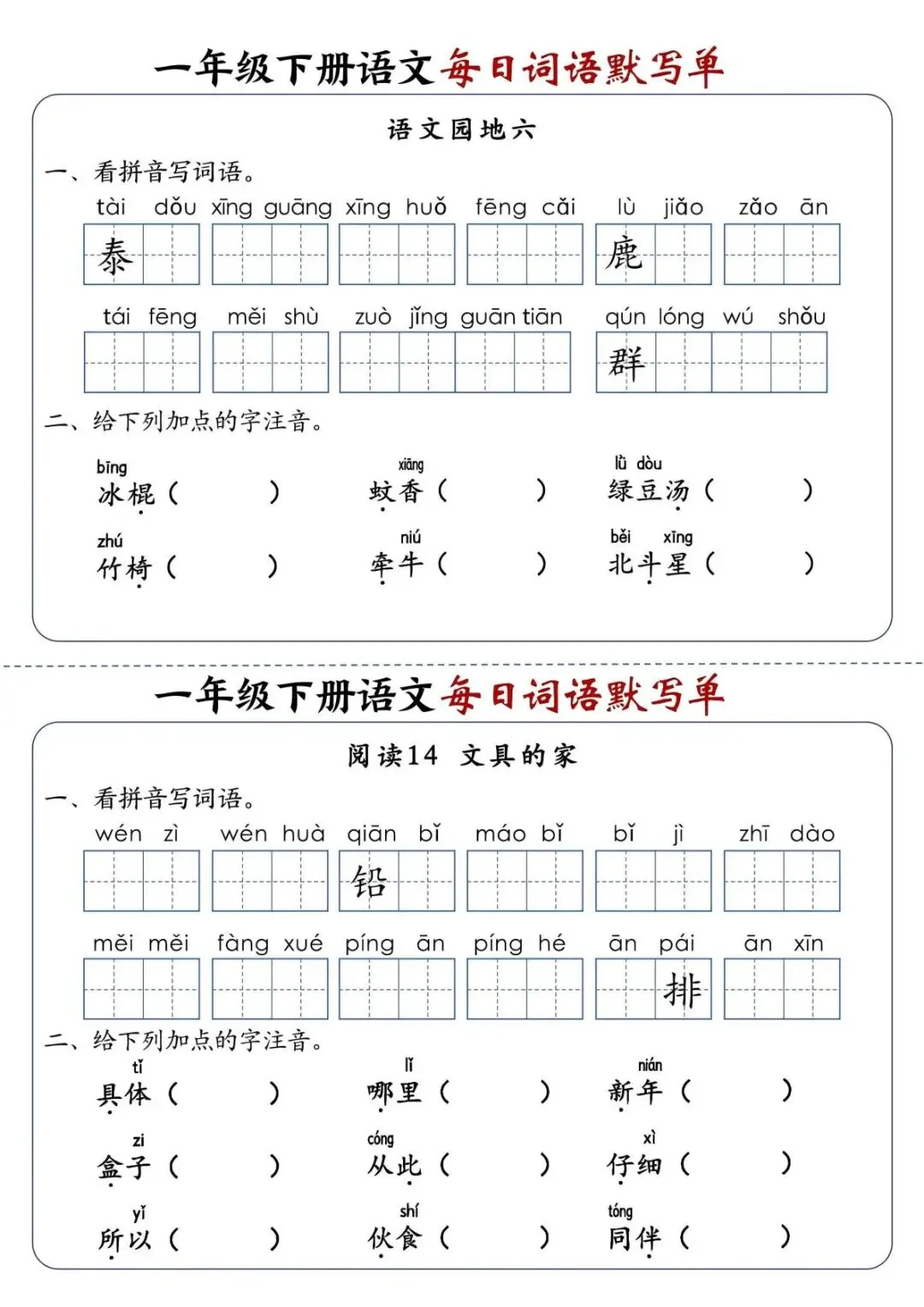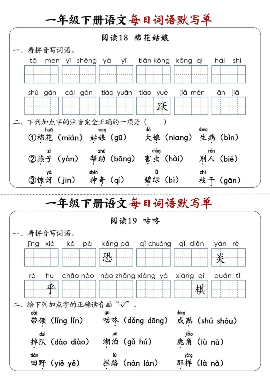 一年级下册部编版语文《每日词语默写单》附答案| 电子版可打印.看拼音写词语、加点字读音辨析两大题型,贴合教材考点,每日一练夯实字词基础。孩子逐页巩固,轻松掌握生字词,为语文学习筑牢根基,家长辅导、孩子自学都超实用!需要的家长抓紧领取一份给孩子打印🖨️出来,让孩子练一练吧✍🏻欢迎分享到班级群或朋友圈,方便家长打印出来助力孩子高效学习!