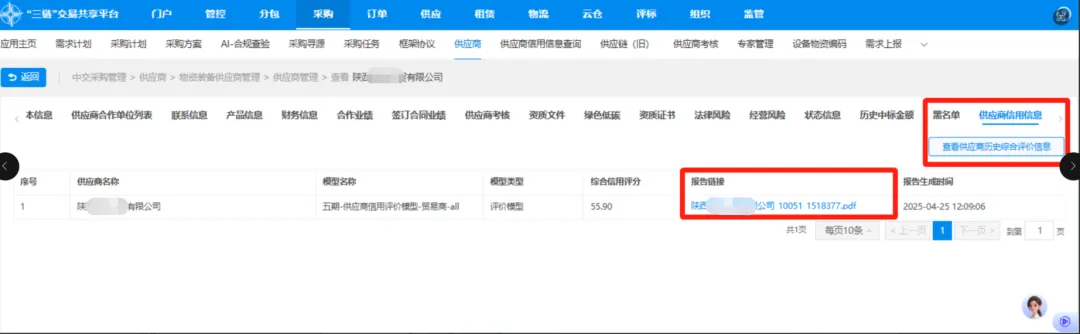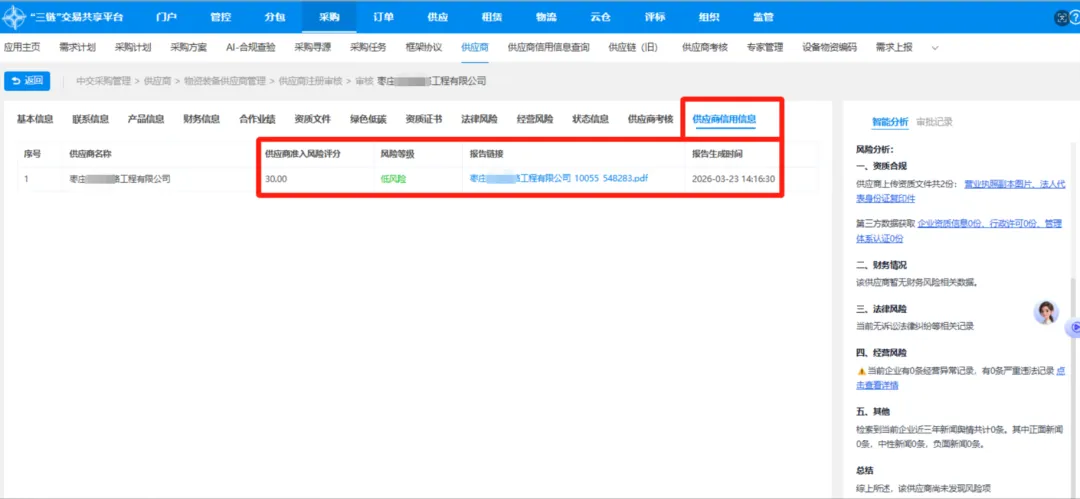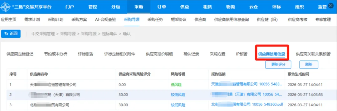 在采购方案邀请供应商、寻源评标定标环节,依托多维信用画像生成采购风险评分报告,精准评估供应商适配性与合作风险。
