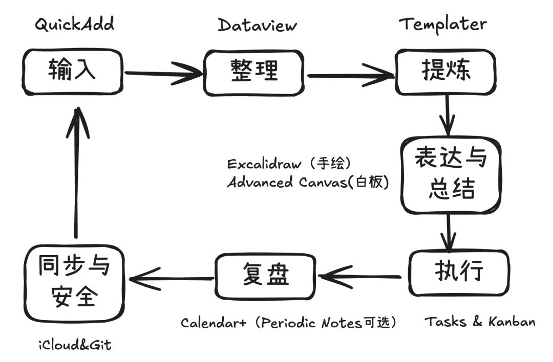 Obsidian软件始终是一个工具,为了更好的服务我们,在使用和探索的过程中,我们一定要结合自己的需求,整合有价值且适合我们应用场景的插件,形成一个能对我们的生活形成有效服务的闭环系统。如下闭环图可见:
