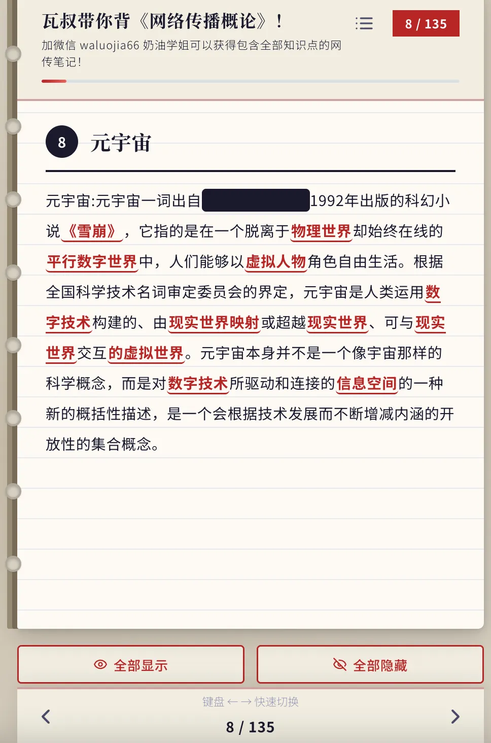所以我做了一件事:把整本《网络传播概论》(第五版)拆成了137张背诵卡片,做成了一个可以直接用的背诵工具。