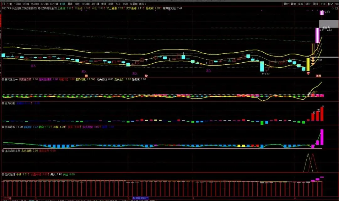 双紫:当“共振追涨”与“强势起爆”两个副图指标同时出现紫色信号柱时,定义为“双紫”,代表资金合力与爆发点形成共振。