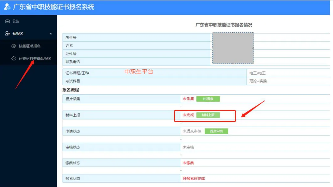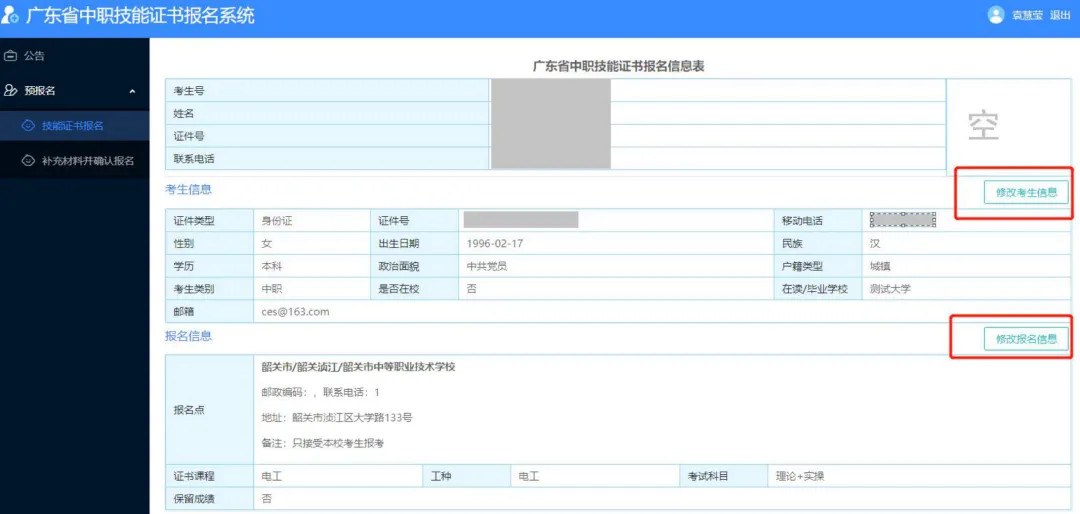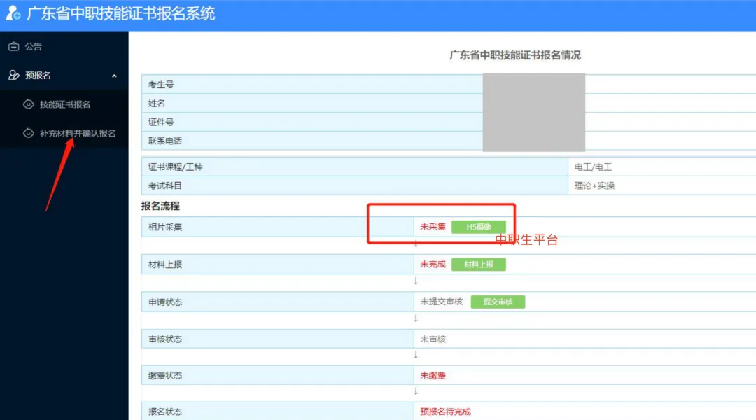 2.考生须认真核对《考生报名信息表》,确保各项信息真实准确。如因考生信息错误导致无法正常考试、无法获得有效的合格证书的,后果由考生自行承担。各级招生考试机构要高度重视考生信息数据的采集工作,各有关报名点要认真指导考生完成报考信息(姓名、身份证号码、相片等)的填报、校对工作。考生报考信息填写完成后,系统会自动生成考生号并在页面上显示,考生还需继续完成上传(户口本、学生证等)资料,进行相片采集,信息确认并提交审核。