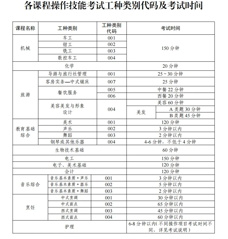2.其他课程类别操作技能考试由各市招生考试机构根据实际情况在6月27日至7月12日内完成。各门课程操作技能考试工种类别代码及考试时间详见附件1。