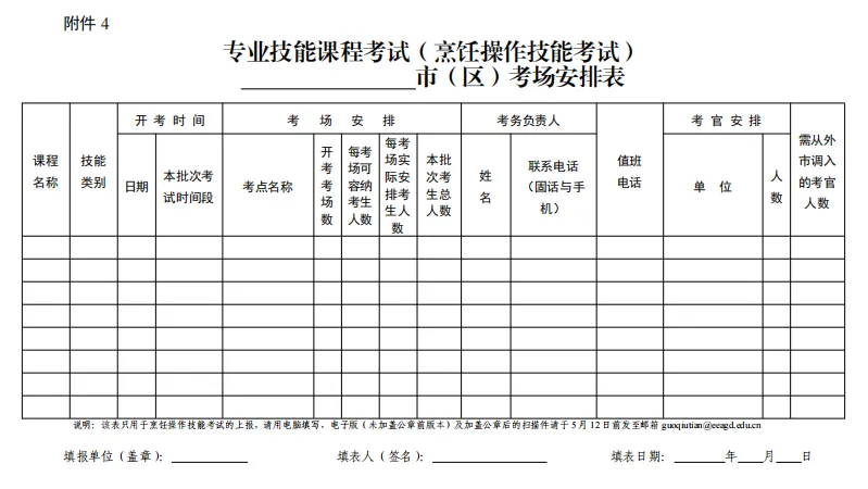 (一)理论考试及实操考试由各地市编排考场,其中理论考试考点必须安排在国家教育考试标准化考点,烹饪实操考试由省考试院统一安排考点后,考点所在地市负责编排考场。各地市于5月12日前在系统录入考点考场数据和完成编排,并同步填写《烹饪考试考场安排表》(附件4)报省教育考试院。