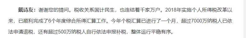4月1日,国家税务总局政策法规司司长戴诗友在新闻发布会上公布了一组数据:今年个税汇算已进行了一个月,超过7000万纳税人已依法申请退税,还有超过500万纳税人自行依法申报补税,整体运行平稳有序。