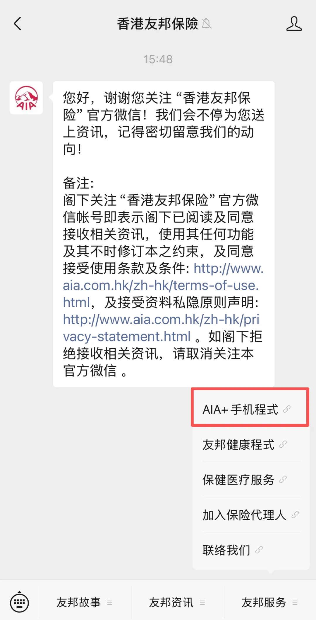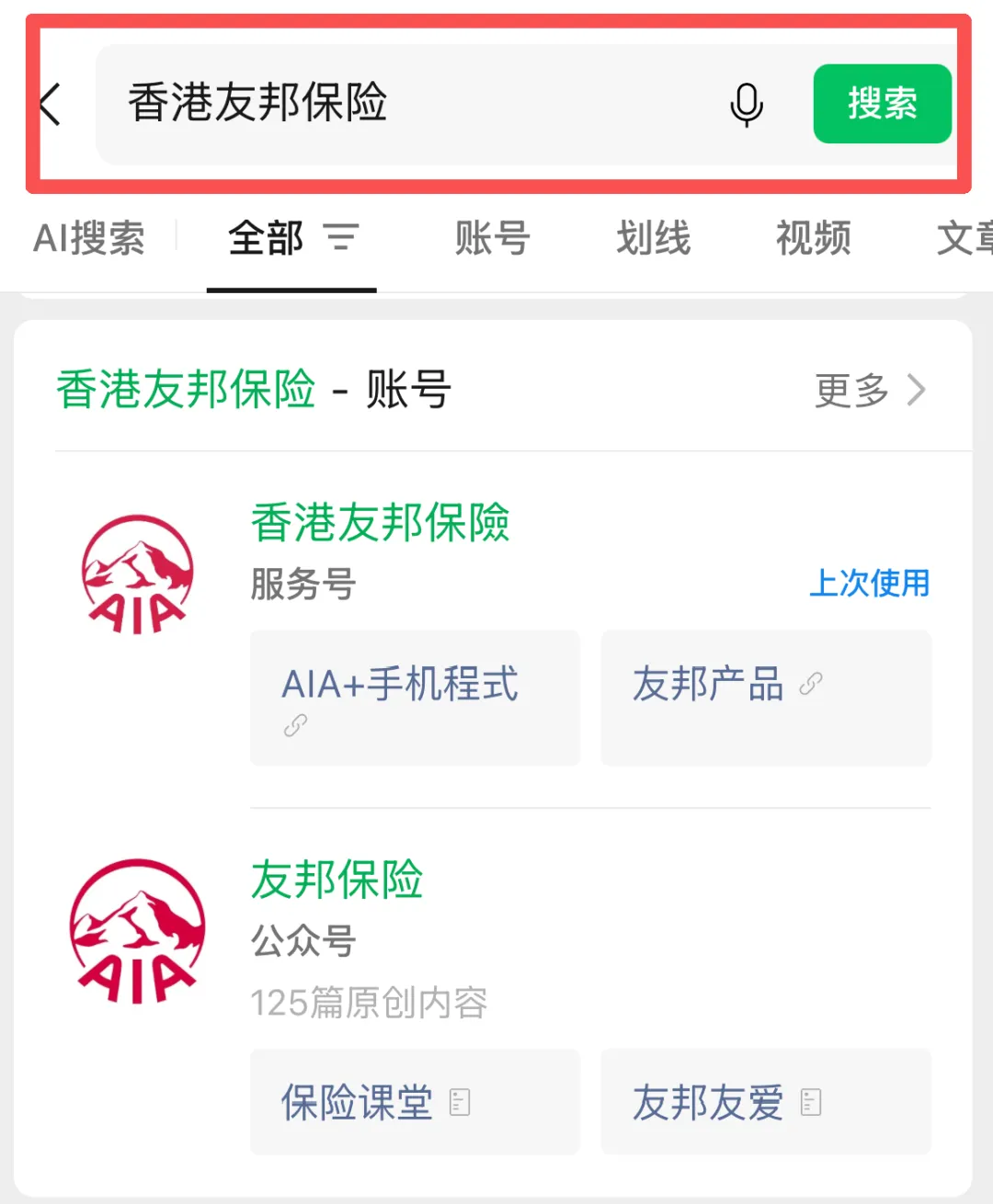 1.在微信APP内-搜索栏输入“香港友邦保险”,找到AIA公众号并进入。进入公众号后,点击下方菜单栏中的「友邦服务」