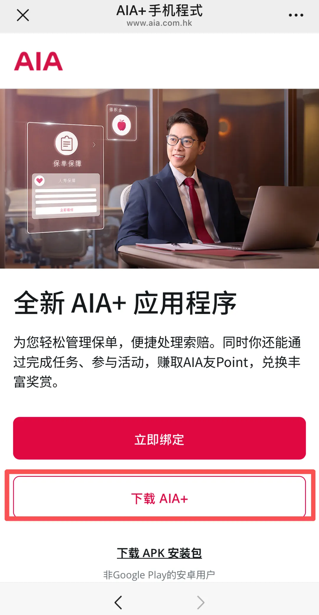 >内地安卓端:可透过三种方式下载——①扫描官方提供的二维码,获取Apk安装包。②通过“香港友邦保险”微信公众号,按指引一步步操作下载。③华为应用市场(预计在今年10月正式上线后可直接搜索下载)