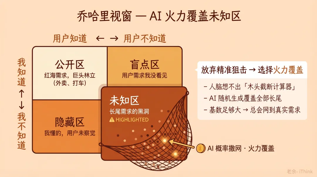 我们平时做产品,眼睛只盯着“公开区”(我知道,用户也知道的需求,比如打车、外卖)。这里的竞争是一片红海,巨头林立。但人类的需求是极其复杂和碎片的。有大量极其奇葩、极其长尾的需求,隐藏在“未知区”(我不知道,用户在遇到特定场景前也不知道)。