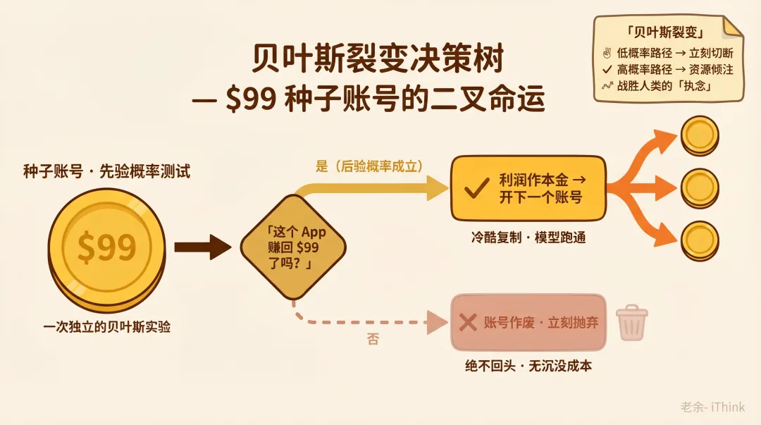 • 赚回3个99美元(后验概率证明模型成立) -> 利润作为本金,开下一个账号,继续裂变。 -