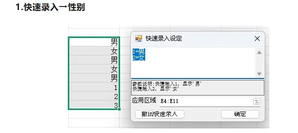用法:在单元格里只需要输入1和2,调用快速录入功能,1自动转成「男」,2自动转成「女」 -