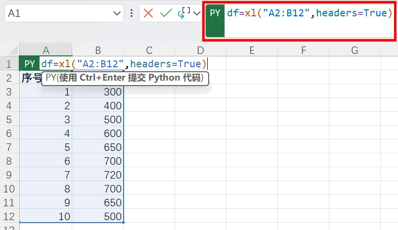 选择单元格A1,输入:=py,按Tab键启用Python编码。在其中输入Python代码,如下图2所示。