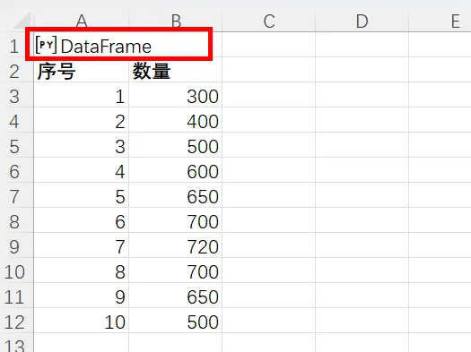 上述代码使用df定义了单元格区域A2:B12中的数据集,现在就可以在所有Python脚本中简单地使用df,用来方便地在数据操作中使用单元格区域A2:E12。从图3中可以看到,命名为DataFrame的一个Python对象。