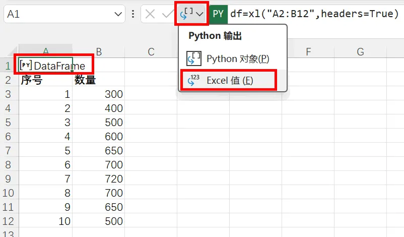 如果要查看底层数据,那么选择包含要检查的Python对象的单元格,示例中为单元格A1。然后,单击编辑栏左侧的下拉菜单,选择“Excel值”选项。如下图4所示。