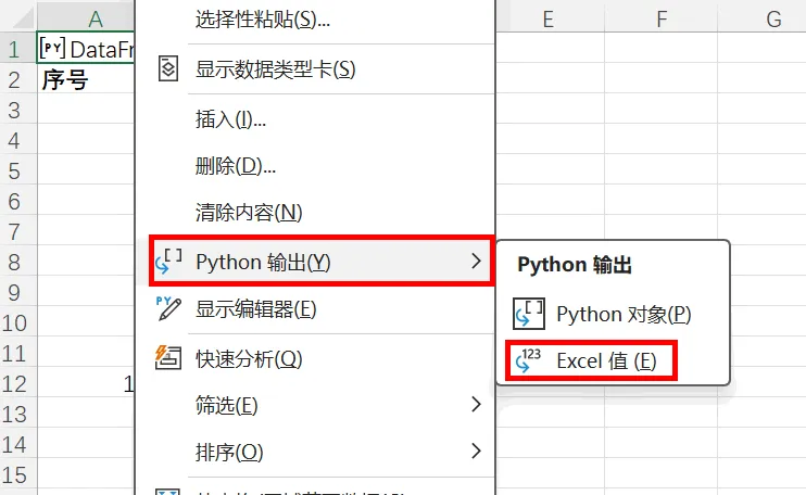 另一种方法是右键单击Python DataFrame单元格,从快捷菜单中选择“Excel值”选项。如下图5所示。